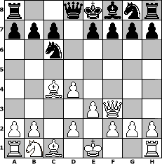 game notation in PGN-format [Event "Auf Die WM!!!!!!!!!!!! (2010 werden wir Meister)"] [Site "www.myChess.de"] [Date "2006.07.21"] [Round "2"] [White "JerryWho"] [Black "Martin2008"] [ECO "D02"] [WhitemyELO "1587"] [BlackmyELO "1429"] [Result "1-0"] [TimeControl "10/2592000"] [WhiteDays "29"] [BlackDays "00"] [MyChessNo "27080"] 1. d4 d5 2. Nf3 Nc6 3. e3 Bg4 4. c4 Bxf3 5. Qxf3 dxc4 6. Bxc4 1-0 position notation in FEN-format r2qkbnr/ppp1pppp/2n5/8/2BP4/4PQ2/PP1P1PPP/RNB1K2R - KQkq - 0 6 Captured white pieces: Captured black pieces: Click on a captured piece in order to display the desired move!