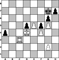 game notation in PGN-format [Event "Gunnis Spätsommerturnier"] [Site "www.myChess.de"] [Date "2018.09.07"] [Round "1"] [White "Geisterreiter"] [Black "beowulf"] [ECO "D01"] [WhitemyELO "1336"] [BlackmyELO "1382"] [Result "1-0"] [TimeControl "10/2592000"] [WhiteDays "133"] [BlackDays "150"] [MyChessNo "112995"] 1. d4 d5 2. Nc3 c6 3. h3 Bf5 4. e3 Nf6 5. Bd3 Qc8 6. Nf3 Bg6 7. Ne5 Nbd7 8. Bd2 Nxe5 9. dxe5 Nd7 10. f4 Bxd3 11. cxd3 e6 12. a3 Be7 13. O-O f5 14. d4 O-O 15. Qf3 c5 16. Ne2 a5 17. Rac1 c4 18. Qg3 b5 19. Kf2 b4 20. h4 Qd8 21. Rh1 Rf7 22. Ng1 bxa3 23. b3 Nb6 24. Qh3 cxb3 25. Nf3 Kf8 26. Ng5 Bxg5 27. hxg5 g6 28. Rc6 Nc4 29. Bc3 Rc8 30. Rxe6 Nxe3 31. Qxe3 b2 32. Qd2 Qd7 33. Rb6 Qc7 34. Rb3 Rb8 35. Rxb8+ Qxb8 36. Bxb2 Qxb2 37. Ke2 Qxd2+ 38. Kxd2 Rb7 39. Kc2 a4 40. Rb1 Rc7+ 41. Kd3 Rc6 42. Ra1 Kg7 43. Rxa3 Rc4 44. Rc3 Rxd4+ 45. Kxd4 1-0 position notation in FEN-format 8/6kp/6p1/3pPpP1/p2K1P2/2R5/6P1/8 - - - 0 45 Captured white pieces: Captured black pieces: Click on a captured piece in order to display the desired move!