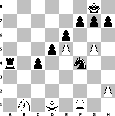 game notation in PGN-format [Event "Neuj"] [Site "www.myChess.de"] [Date "2012.01.01"] [Round "1"] [White "faustballer"] [Black "Gauss1233"] [ECO "B01"] [WhitemyELO "1488"] [BlackmyELO "1392"] [Result "1-0"] [TimeControl "10/864000"] [WhiteDays "10"] [BlackDays "00"] [MyChessNo "78840"] 1. e4 d5 2. e5 e6 3. d4 c5 4. c3 cxd4 5. cxd4 Nc6 6. a3 Nge7 7. b4 Nf5 8. Bb5 Qb6 9. Bxc6+ bxc6 10. Ne2 Ba6 11. Bb2 Bxe2 12. Kxe2 a5 13. g4 Qb5+ 14. Qd3 Qxd3+ 15. Kxd3 Nh6 16. bxa5 c5 17. g5 c4+ 18. Kc2 Nf5 19. Nd2 Rxa5 20. a4 Be7 21. f4 O-O 22. Ba3 Nxd4+ 23. Kd1 Bxa3 24. Rxa3 Rfa8 25. Nb1 Rxa4 26. Rxa4 Rxa4 27. Kc1 Ne2+ 28. Kd1 Nxf4 29. Rf1 1-0 position notation in FEN-format 6k1/5ppp/4p3/3pP1P1/r1p2n2/8/7P/1N1K1R2 - - - 1 29 Captured white pieces: Captured black pieces: Click on a captured piece in order to display the desired move!