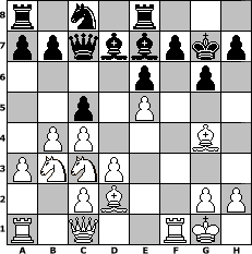 game notation in PGN-format [Event "2. Chess960/1"] [Site "www.myChess.de"] [Date "2008.03.15"] [Round "1"] [White "Stabiloboss"] [Black "Heinz@"] [Variant "Fischerrandom"] [SetUp "1"] [FEN "rqnbbknr/pppppppp/8/8/8/8/PPPPPPPP/RQNBBKNR w KQkq - 0 1"] [WhitemyELO "1524"] [BlackmyELO "1500"] [Result "1-0"] [TimeControl "10/3456000"] [WhiteDays "27"] [BlackDays "60"] [MyChessNo "43414"] 1. c4 c5 2. e4 Nb6 3. d3 d6 4. Nge2 Nf6 5. O-O g6 6. Bd2 Kg7 7. f4 e6 8. Nb3 Qc7 9. Qc1 Rg8 10. Nc3 Bc6 11. Na5 Re8 12. a3 Be7 13. b4 Bd7 14. Nb3 Nc8 15. e5 dxe5 16. fxe5 Ng4 17. Bxg4 1-0 position notation in FEN-format r1n1r3/ppqbbpkp/4p1p1/2p1P3/1PP3B1/PNNP4/2PB2PP/R1Q2RK1 - - - 0 17 Captured white pieces: Captured black pieces: Click on a captured piece in order to display the desired move!