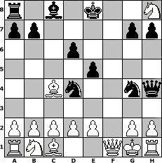 game notation in PGN-format [Event "Husarenritt"] [Site "www.myChess.de"] [Date "2005.11.23"] [Round "1"] [White "otto01"] [Black "Vouivre"] [ECO "C57"] [WhitemyELO "2120"] [BlackmyELO "1462"] [Result "1-0"] [TimeControl "10/1728000"] [WhiteDays "40"] [BlackDays "38"] [MyChessNo "19953"] 1. e4 e5 2. Nf3 Nc6 3. Bc4 Nf6 4. Ng5 Bc5 5. Nxf7 Bxf2+ 6. Kf1 Qe7 7. Nxh8 d5 8. exd5 Nd4 9. d6 cxd6 10. Kxf2 Ng4+ 11. Kg1 Qh4 12. Qf1 1-0 position notation in FEN-format r1b1k2N/pp4pp/3p4/4p3/2Bn2nq/8/PPPPP1PP/RNB2QKR - kq - 4 12 Captured white pieces: Captured black pieces: Click on a captured piece in order to display the desired move!