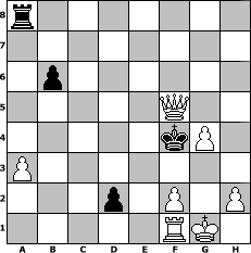 game notation in PGN-format [Event "CHESSMASTERS"] [Site "www.myChess.de"] [Date "2005.08.13"] [Round "2"] [White "Fuffy"] [Black "Gno"] [ECO "A00"] [WhitemyELO "1238"] [BlackmyELO "1337"] [Result "1-0"] [TimeControl "10/2592000"] [WhiteDays "120"] [BlackDays "120"] [MyChessNo "16191"] 1. d3 g6 2. Nc3 Bg7 3. Ne4 d5 4. Ng5 h6 5. N5f3 Bg4 6. d4 Bxf3 7. Nxf3 c6 8. e3 e6 9. b4 a5 10. c3 Nd7 11. Bd3 axb4 12. cxb4 b6 13. Bd2 c5 14. Bb5 Ne7 15. Bc3 O-O 16. O-O cxd4 17. exd4 Nf5 18. Ne5 Qe7 19. a3 Rfc8 20. Bb2 h5 21. Nxd7 Qd6 22. Rc1 Rd8 23. Qe2 Rxd7 24. Bxd7 Qxd7 25. b5 Nxd4 26. Qe3 Nf5 27. Bxg7 Kxg7 28. Qe5+ Kh7 29. Rc7 Qxb5 30. Rxf7+ Kh6 31. Qxe6 Kg5 32. Rf6 d4 33. Rxg6+ Kf4 34. Rf6 Re8 35. Qf7 Ra8 36. Qxh5 d3 37. g4 d2 38. Rxf5+ Qxf5 39. Qxf5# 1-0 position notation in FEN-format r7/8/1p6/5Q2/5kP1/P7/3p1P1P/5RK1 - - - 0 39 Captured white pieces: Captured black pieces: Click on a captured piece in order to display the desired move!