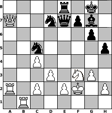 game notation in PGN-format [Event "Einstand"] [Site "www.myChess.de"] [Date "2010.12.10"] [Round "1"] [White "Duschgel"] [Black "reisender"] [ECO "A21"] [WhitemyELO "1549"] [BlackmyELO "1328"] [Result "1/2-1/2"] [TimeControl "10/864000"] [WhiteDays "10"] [BlackDays "10"] [MyChessNo "70473"] 1. c4 e5 2. Nc3 d6 3. g3 g6 4. Bg2 Bg7 5. d3 Nd7 6. Nf3 Ngf6 7. O-O O-O 8. b4 c6 9. a4 b6 10. Nd2 Bb7 11. b5 Rc8 12. Ba3 Qc7 13. bxc6 Bxc6 14. Bxc6 Qxc6 15. Nb5 Nc5 16. Nxa7 Qb7 17. Nxc8 Rxc8 18. Rb1 Qa8 19. Rxb6 Nxa4 20. Rxd6 Nc3 21. Qe1 Qxa3 22. Rb6 Qa7 23. Rb3 Na4 24. Qb1 Nc5 25. Rb5 Bf8 26. Qb2 Re8 27. Ra1 Qe7 28. Rb6 Bg7 29. Qa3 Nfd7 30. Rbb1 e4 31. Ra2 e3 32. Nf3 exf2+ 33. Kxf2 h5 34. Qa7 1/2-1/2 position notation in FEN-format 4r1k1/Q2nqpb1/6p1/2n4p/2P5/3P1NP1/R1P1PK1P/1R6 - - - 1 34 Captured white pieces: Captured black pieces: Click on a captured piece in order to display the desired move!