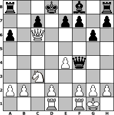 game notation in PGN-format [Event "Faires Schach"] [Site "www.myChess.de"] [Date "2007.03.25"] [Round "1"] [White "Seneca"] [Black "bluescreenlover"] [ECO "A50"] [WhitemyELO "1541"] [BlackmyELO "1370"] [Result "1-0"] [TimeControl "10/3456000"] [WhiteDays "71"] [BlackDays "69"] [MyChessNo "33732"] 1. d4 Nf6 2. c4 d5 3. cxd5 Nxd5 4. Nf3 Bf5 5. Nc3 Nb4 6. e4 Bg4 7. Qa4+ N4c6 8. d5 Bd7 9. dxc6 Bxc6 10. Bb5 a6 11. Bxc6+ Nxc6 12. Ne5 Qd6 13. Nxc6 bxc6 14. O-O g6 15. Bf4 Qxf4 16. Qxc6+ Kd8 17. Rad1+ 1-0 position notation in FEN-format r2k1b1r/2p1pp1p/p1Q3p1/8/4Pq2/2N5/PP1P1PPP/3R1RK1 - - - 2 17 Captured white pieces: Captured black pieces: Click on a captured piece in order to display the desired move!