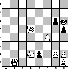 game notation in PGN-format [Event "Maischach"] [Site "www.myChess.de"] [Date "2014.04.26"] [Round "2"] [White "Haneken"] [Black "wiesel"] [ECO "D00"] [WhitemyELO "1068"] [BlackmyELO "1184"] [Result "0-1"] [TimeControl "10/2592000"] [WhiteDays "143"] [BlackDays "146"] [MyChessNo "94118"] 1. d4 d5 2. e4 e5 3. Nf3 Nf6 4. Bd3 dxe4 5. Bb5+ c6 6. Ba4 Bb4+ 7. Nfd2 Qxd4 8. c3 Bxc3 9. bxc3 Qd3 10. Bc2 Qd5 11. Bb3 Qc5 12. Qe2 Bg4 13. Qc4 Qe7 14. Nxe4 Be6 15. Qd3 Nd5 16. Bxd5 cxd5 17. Bg5 Qc7 18. Qb5+ Nd7 19. Ned2 O-O 20. Qd3 Rfe8 21. Na3 a6 22. O-O e4 23. Qd4 Ne5 24. f3 Rad8 25. Bxd8 Rxd8 26. f4 Ng6 27. Rab1 Ne7 28. Rfc1 Rb8 29. Qe5 Qc5+ 30. Qd4 Qxa3 31. Qe5 Qxa2 32. Qxb8+ Nc8 33. Nb3 e3 34. Qxb7 Qf2+ 35. Kh1 h5 36. Rf1 Qc2 37. Qxa6 Qxc3 38. Rfc1 Qb4 39. Rxc8+ Bxc8 40. Qxc8+ Kh7 41. Qf5+ g6 42. Qxf7+ Kh6 43. Qxd5 e2 44. Nd2 Qxb1+ 0-1 position notation in FEN-format 8/8/6pk/3Q3p/5P2/8/3Np1PP/1q5K - - - 0 45 Captured white pieces: Captured black pieces: Click on a captured piece in order to display the desired move!