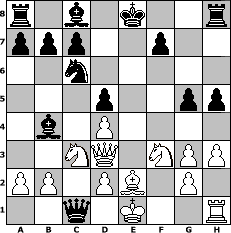game notation in PGN-format [Event "Winter 2011/12"] [Site "www.myChess.de"] [Date "2011.12.22"] [Round "2"] [White "lasker"] [Black "HPB2005"] [ECO "D50"] [WhitemyELO "1286"] [BlackmyELO "1936"] [Result "0-1"] [TimeControl "10/2592000"] [WhiteDays "49"] [BlackDays "48"] [MyChessNo "78409"] 1. d4 d5 2. c4 e6 3. Nc3 Nf6 4. Bg5 Nc6 5. Nf3 Bb4 6. e3 h6 7. Bh4 g5 8. Bg3 Ne4 9. Rc1 h5 10. cxd5 exd5 11. h3 Qe7 12. Be2 Nxg3 13. fxg3 Qxe3 14. Qd3 Qxc1+ 0-1 position notation in FEN-format r1b1k2r/ppp2p2/2n5/3p2pp/1b1P4/2NQ1NPP/PP1PB1P1/2q1K2R - Kkq - 0 15 Captured white pieces: Captured black pieces: Click on a captured piece in order to display the desired move!
