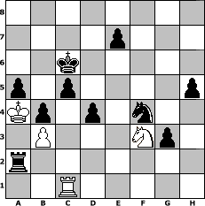 game notation in PGN-format [Event "?"] [Site "www.myChess.de"] [Date "2023.11.14"] [Round "?"] [White "Achimkogge"] [Black "faustballer"] [Variant "Fischerrandom"] [SetUp "1"] [FEN "rbnkbrnq/pppppppp/8/8/8/8/PPPPPPPP/RBNKBRNQ w KQkq - 0 1"] [WhitemyELO "1289"] [BlackmyELO "1511"] [Result "0-1"] [TimeControl "10/2592000"] [WhiteDays "176"] [BlackDays "180"] [MyChessNo "131083"] 1. d4 d5 2. g4 Bc6 3. Nb3 g6 4. Na5 Qxd4+ 5. Kc1 Qxg4 6. h3 Qd7 7. Nxc6+ Qxc6 8. Bc3 Nf6 9. f3 Nh5 10. Qh2 Nb6 11. b3 Qe6 12. Bd2 c5 13. Qg2 Be5 14. c3 Qf6 15. f4 Bxc3 16. Bxc3 Qxc3+ 17. Bc2 Qxa1+ 18. Bb1 Qc3+ 19. Bc2 Qg3 20. Qxg3 Nxg3 21. Rf2 O-O-O 22. Rf3 Ne4 23. Re3 f5 24. Nf3 d4 25. Rd3 Nc3 26. Ng5 Nxa2+ 27. Kb2 Nb4 28. Rd2 Rf7 29. Nxf7 Rd5 30. Bb1 a5 31. e4 fxe4 32. Bxe4 Rh5 33. Ng5 N4d5 34. Bxd5 Nxd5 35. Rf2 Rh4 36. Ne6 b6 37. Rf3 h6 38. Ka3 Kb7 39. Nd8+ Kc7 40. Ne6+ Kd6 41. Nf8 Nxf4 42. Rg3 g5 43. Ka4 Rxh3 44. Rg1 Kc6 45. Re1 Re3 46. Rh1 h5 47. Nh7 Re2 48. Ka3 g4 49. Ng5 g3 50. Nf3 b5 51. Rc1 b4+ 52. Ka4 Ra2# 0-1 position notation in FEN-format 8/4p3/2k5/p1p4p/Kp1p1n2/1P3Np1/r7/2R5 - - - 2 53 Captured white pieces: Captured black pieces: Click on a captured piece in order to display the desired move!