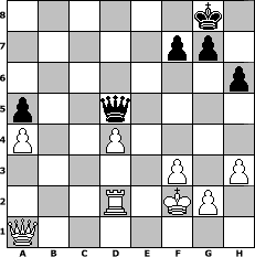 game notation in PGN-format [Event "Ja, is denn heut scho Weihnachten?"] [Site "www.myChess.de"] [Date "2014.12.06"] [Round "1"] [White "Joschi"] [Black "Knight"] [ECO "C78"] [WhitemyELO "1604"] [BlackmyELO "1316"] [Result "1-0"] [TimeControl "10/2592000"] [WhiteDays "120"] [BlackDays "119"] [MyChessNo "97069"] 1. e4 e5 2. Nf3 Nc6 3. Bb5 a6 4. Ba4 Nf6 5. O-O Bc5 6. d3 O-O 7. Re1 b5 8. Bb3 d6 9. h3 Bb7 10. Be3 Bxe3 11. Rxe3 Nd4 12. Nxd4 exd4 13. Re1 Re8 14. c3 dxc3 15. Nxc3 c5 16. a4 b4 17. Ne2 a5 18. Ng3 d5 19. exd5 Rxe1+ 20. Qxe1 Bxd5 21. Bxd5 Qxd5 22. Qe3 Re8 23. Qd2 c4 24. d4 Ne4 25. Nxe4 Rxe4 26. Rd1 c3 27. bxc3 bxc3 28. Qxc3 h6 29. f3 Re2 30. Rd2 Re1+ 31. Kf2 Ra1 32. Qxa1 1-0 position notation in FEN-format 6k1/5pp1/7p/p2q4/P2P4/5P1P/3R1KP1/Q7 - - - 0 32 Captured white pieces: ![]() ![]() ![]() ![]() ![]() ![]() ![]() ![]() ![]() ![]() ![]() ![]() ![]() ![]() ![]() Captured black pieces: ![]() ![]() ![]() ![]() ![]() ![]() ![]() ![]() ![]() ![]() ![]() ![]() ![]() ![]() ![]() Click on a captured piece in order to display the desired move!