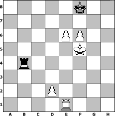 game notation in PGN-format [Event "QGD: Orthodox Verteidigung"] [Site "www.myChess.de"] [Date "2008.08.11"] [Round "1"] [White "Ostseeboy"] [Black "Steppenwolf"] [ECO "D64"] [WhitemyELO "1327"] [BlackmyELO "1180"] [Result "1-0"] [TimeControl "10/2592000"] [WhiteDays "150"] [BlackDays "092"] [MyChessNo "47031"] 1. d4 d5 2. c4 e6 3. Nc3 Nf6 4. Bg5 Be7 5. e3 O-O 6. Nf3 Nbd7 7. Rc1 c6 8. Qc2 a6 9. Be2 h6 10. Bh4 Bb4 11. cxd5 cxd5 12. O-O Bxc3 13. Qxc3 a5 14. a4 Ne4 15. Bxd8 Nxc3 16. Rxc3 Rxd8 17. Ne5 Nxe5 18. dxe5 Bd7 19. Rc7 Bxa4 20. Rxb7 Rab8 21. Ra7 Rxb2 22. Re1 Rdb8 23. Rxa5 Bc2 24. g3 Be4 25. f3 Bf5 26. h4 Bh3 27. Kh2 Bf5 28. g4 Bc2 29. Kg3 f5 30. gxf5 exf5 31. Rxd5 g5 32. hxg5 hxg5 33. Bc4 f4+ 34. exf4 gxf4+ 35. Kxf4 Rf8+ 36. Kg4 Bf5+ 37. Kg3 Be6 38. Rc5 Bxc4 39. Rxc4 Rb3 40. Rf4 Rbb8 41. Rxf8+ Kxf8 42. f4 Rb3+ 43. Kg4 Rb7 44. f5 Kf7 45. e6+ Kf8 46. f6 Rb4+ 47. Kf5 1-0 position notation in FEN-format 5k2/8/4PP2/5K2/1r6/8/3P4/4R3 - - - 2 47 Captured white pieces: ![]() ![]() ![]() ![]() ![]() ![]() ![]() ![]() ![]() ![]() ![]() ![]() ![]() ![]() ![]() Captured black pieces: ![]() ![]() ![]() ![]() ![]() ![]() ![]() ![]() ![]() ![]() ![]() ![]() ![]() ![]() ![]() Click on a captured piece in order to display the desired move!