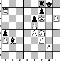 game notation in PGN-format [Event "Neujahrsturnier 2014"] [Site "www.myChess.de"] [Date "2014.01.01"] [Round "1"] [White "pepo47"] [Black "Lemmi11"] [ECO "D02"] [WhitemyELO "2084"] [BlackmyELO "1836"] [Result "1-0"] [TimeControl "10/3456000"] [WhiteDays "235"] [BlackDays "166"] [MyChessNo "91902"] 1. d4 d5 2. Nf3 Nc6 3. c4 e6 4. Nc3 Nf6 5. a3 Be7 6. Bg5 h6 7. Bh4 dxc4 8. e3 Na5 9. Bxf6 Bxf6 10. Bxc4 Nxc4 11. Qa4+ Qd7 12. Qxc4 b6 13. Ne5 Bxe5 14. dxe5 O-O 15. O-O Bb7 16. Rfd1 Qe7 17. f3 Rad8 18. Kf2 h5 19. h4 Bd5 20. Qf4 c5 21. Rd3 Bb7 22. Rd1 Rxd3 23. Rxd3 Bc6 24. Rd6 Rc8 25. Ne2 Bd5 26. Kg3 b5 27. e4 Bc4 28. Ng1 a5 29. Qc1 Bb3 30. Qc3 a4 31. Nh3 Qc7 32. Qd2 c4 33. Qg5 c3 34. bxc3 g6 35. Qf6 Re8 36. Kf4 Qe7 37. Kg5 Qf8 38. Rd7 Qg7 39. Nf4 Rc8 40. Qxg7+ Kxg7 41. Nxg6 Rxc3 42. Nf4 Rc8 43. Nxh5+ Kf8 44. Kf6 Kg8 45. Rb7 Rf8 46. Rxb5 Bc4 47. Ra5 Bb3 48. Ra7 Bd1 49. Nf4 Bc2 50. h5 Bb3 51. h6 1-0 position notation in FEN-format 5rk1/R4p2/4pK1P/4P3/p3PN2/Pb3P2/6P1/8 - - - 0 51 Captured white pieces: Captured black pieces: Click on a captured piece in order to display the desired move!