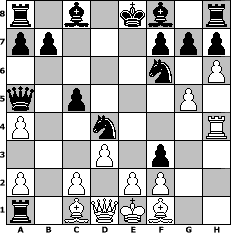 game notation in PGN-format [Event "9er"] [Site "www.myChess.de"] [Date "2010.05.03"] [Round "1"] [White "micha62"] [Black "Lohl"] [ECO "A00"] [WhitemyELO "1373"] [BlackmyELO "1566"] [Result "0-1"] [TimeControl "10/2592000"] [WhiteDays "22"] [BlackDays "24"] [MyChessNo "65265"] 1. a3 Nf6 2. Nf3 d5 3. d3 c5 4. a4 Nc6 5. h3 e5 6. Nc3 d4 7. h4 dxc3 8. h5 e4 9. g3 cxb2 10. g4 bxa1=Q 11. h6 exf3 12. g5 Nd4 13. Rh4 Qa5+ 0-1 position notation in FEN-format r1b1kb1r/pp3ppp/5n1P/q1p3P1/P2n3R/3P1p2/P1P1PP2/r1BQKB2 - Qkq - 3 14 Captured white pieces: Captured black pieces: Click on a captured piece in order to display the desired move!