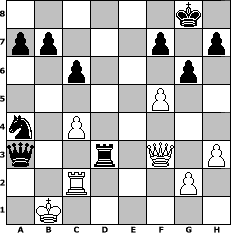 game notation in PGN-format [Event "Auf ein Neues 2"] [Site "www.myChess.de"] [Date "2021.03.20"] [Round "1"] [White "beowulf"] [Black "martinus"] [ECO "A16"] [WhitemyELO "1411"] [BlackmyELO "1618"] [Result "0-1"] [TimeControl "10/2592000"] [WhiteDays "115"] [BlackDays "118"] [MyChessNo "121585"] 1. c4 Nf6 2. Nc3 g6 3. d4 Bg7 4. Bg5 d6 5. Nf3 O-O 6. e4 Bg4 7. h3 Bxf3 8. Qxf3 c6 9. e5 dxe5 10. dxe5 Nfd7 11. O-O-O Qc7 12. Bxe7 Nxe5 13. Qg3 Qxe7 14. f4 Bh6 15. Kb1 Ned7 16. Bd3 Bg7 17. Rhe1 Qb4 18. Kc2 Bxc3 19. bxc3 Qa4+ 20. Kb2 Nc5 21. Bc2 Qxc4 22. Bb3 Nxb3 23. axb3 Qb5 24. Rd2 Na6 25. Red1 Nc5 26. f5 Qxb3+ 27. Kc1 Qa3+ 28. Kb1 Na4 29. Rc2 Qb3+ 30. Kc1 Qa3+ 31. Kb1 Rad8 32. Rxd8 Rxd8 33. Qf3 Rd5 34. c4 Rd3 0-1 position notation in FEN-format 6k1/pp3p1p/2p3p1/5P2/n1P5/q2r1Q1P/2R3P1/1K6 - - - 1 35 Captured white pieces: Captured black pieces: Click on a captured piece in order to display the desired move!
