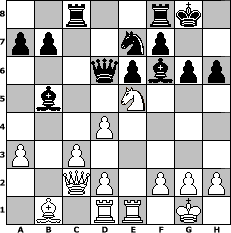 game notation in PGN-format [Event "Frühling 2019"] [Site "www.myChess.de"] [Date "2019.05.10"] [Round "1"] [White "Steffi"] [Black "Ziegert"] [ECO "D31"] [WhitemyELO "1330"] [BlackmyELO "1671"] [Result "0-1"] [TimeControl "10/1728000"] [WhiteDays "53"] [BlackDays "25"] [MyChessNo "114970"] 1. d4 d5 2. c4 e6 3. Nc3 Bb4 4. Nf3 Nf6 5. Bg5 O-O 6. e3 h6 7. Bh4 c5 8. Qc2 dxc4 9. Bxc4 cxd4 10. exd4 Bd7 11. O-O Be7 12. Rad1 Nc6 13. a3 Rc8 14. Ba2 Nd5 15. Bb1 g6 16. Bg3 Bf6 17. Bd6 Nce7 18. Ne5 Nxc3 19. bxc3 Bb5 20. Rfe1 Qxd6 0-1 position notation in FEN-format 2r2rk1/pp2np2/3qpbpp/1b2N3/3P4/P1P5/2QP1PPP/1B1RR1K1 - - - 0 21 Captured white pieces: Captured black pieces: Click on a captured piece in order to display the desired move!