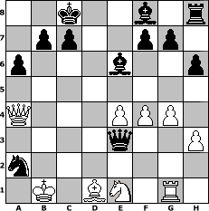 game notation in PGN-format [Event "Fr"] [Site "www.myChess.de"] [Date "2016.01.30"] [Round "1"] [White "paul"] [Black "wolni55"] [ECO "C41"] [WhitemyELO "1335"] [BlackmyELO "1488"] [Result "0-1"] [TimeControl "10/2592000"] [WhiteDays "43"] [BlackDays "80"] [MyChessNo "102288"] 1. e4 e5 2. Nf3 d6 3. h3 a6 4. Nc3 Nf6 5. d3 h6 6. Be3 Nc6 7. Qd2 Be6 8. Be2 Qe7 9. O-O-O O-O-O 10. Rhg1 d5 11. g4 dxe4 12. Ne1 exd3 13. cxd3 e4 14. Qc2 Nb4 15. Qa4 Nfd5 16. dxe4 Nxc3 17. bxc3 Nxa2+ 18. Kb2 Rxd1 19. Bxd1 Qf6 20. f4 Qxc3+ 21. Kb1 Qxe3 0-1 position notation in FEN-format 2k2b1r/1pp2pp1/p3b2p/8/Q3PPP1/4q2P/n7/1K1BN1R1 - - - 0 22 Captured white pieces: Captured black pieces: Click on a captured piece in order to display the desired move!