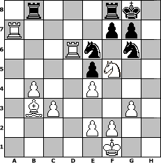 game notation in PGN-format [Event "Schach on the beach"] [Site "www.myChess.de"] [Date "2015.05.21"] [Round "1"] [White "Erich"] [Black "martinus"] [ECO "B32"] [WhitemyELO "2100"] [BlackmyELO "1784"] [Result "1-0"] [TimeControl "10/2592000"] [WhiteDays "120"] [BlackDays "119"] [MyChessNo "99319"] 1. e4 c5 2. Nf3 Nc6 3. d4 cxd4 4. Nxd4 e5 5. Nb5 d6 6. N1c3 a6 7. Na3 Nf6 8. Nc4 b5 9. Ne3 Be7 10. Bd3 O-O 11. O-O Be6 12. Ncd5 Nd7 13. c3 Nc5 14. Bc2 Rb8 15. b4 Nb7 16. a4 Bg5 17. axb5 axb5 18. Qd3 Re8 19. Qxb5 Ne7 20. Qd3 Ng6 21. g3 Bxd5 22. Nxd5 Bxc1 23. Rfxc1 Qg5 24. Rd1 h5 25. Ra7 Nd8 26. Bb3 Ne6 27. Qf3 Rf8 28. Qf5 h4 29. Ne3 Ngf4 30. Kf1 Qxf5 31. Nxf5 hxg3 32. hxg3 Ng6 33. Rxd6 1-0 position notation in FEN-format 1r3rk1/R4pp1/3Rn1n1/4pN2/1P2P3/1BP3P1/4PP2/5K2 - - - 0 33 Captured white pieces: Captured black pieces: Click on a captured piece in order to display the desired move!
