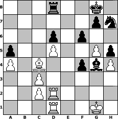 game notation in PGN-format [Event "Winter 2018"] [Site "www.myChess.de"] [Date "2018.01.10"] [Round "1"] [White "Erich"] [Black "larlinde"] [ECO "B32"] [WhitemyELO "2112"] [BlackmyELO "2146"] [Result "1/2-1/2"] [TimeControl "10/2592000"] [WhiteDays "111"] [BlackDays "007"] [MyChessNo "110987"] 1. e4 c5 2. Nf3 Nc6 3. d4 cxd4 4. Nxd4 e5 5. Nf3 Nf6 6. Nc3 Bb4 7. Bc4 O-O 8. O-O Bxc3 9. bxc3 d6 10. Re1 Na5 11. Bb3 b6 12. h3 Qe7 13. Ba3 Rd8 14. Qd3 Nb7 15. Rad1 h6 16. Nh4 Nc5 17. Qf3 a5 18. Bxc5 bxc5 19. Bc4 Qc7 20. a4 Be6 21. Bb5 c4 22. Nf5 Kh7 23. Ne3 Rac8 24. Rd2 Qb8 25. Red1 Qc7 26. g4 Kg8 27. h4 Qe7 28. Qg2 Nh7 29. Qg3 Rc5 30. f3 Nf6 31. Qf2 Qc7 32. Qe2 h5 33. g5 Nh7 34. f4 exf4 35. Nd5 Rxd5 36. exd5 Bg4 37. Qxc4 Qxc4 38. Bxc4 f6 1/2-1/2 position notation in FEN-format 3r2k1/6pn/3p1p2/p2P2Pp/P1B2pbP/2P5/2PR4/3R2K1 - - - 0 39 Captured white pieces: Captured black pieces: Click on a captured piece in order to display the desired move!
