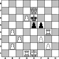 game notation in PGN-format [Event "48/54er Turnier"] [Site "www.myChess.de"] [Date "2010.11.18"] [Round "1"] [White "Andreas54"] [Black "Ilona48"] [ECO "C41"] [WhitemyELO "1491"] [BlackmyELO "1422"] [Result "1-0"] [TimeControl "10/2592000"] [WhiteDays "120"] [BlackDays "118"] [MyChessNo "69937"] 1. e4 e5 2. Nf3 d6 3. Nc3 b6 4. d3 Nc6 5. Be2 Nf6 6. Bg5 Be7 7. Bxf6 Bxf6 8. h4 g5 9. hxg5 Bxg5 10. Rh5 h6 11. d4 O-O 12. Bb5 Nb4 13. dxe5 dxe5 14. Nd5 Bg4 15. Rh2 a6 16. a3 c6 17. axb4 cxd5 18. Bxa6 Bc8 19. Bxc8 Rxc8 20. exd5 Qc7 21. c3 Rfd8 22. Rh5 Kg7 23. Nxg5 hxg5 24. Rxg5+ Kf6 25. Rg4 Qd7 26. Qf3+ Qf5 27. Rd1 Rd6 28. Qxf5+ Ke7 29. Qxc8 Rd8 30. Qc7+ Rd7 31. d6+ Ke6 32. Qxb6 Kf5 33. f3 f6 34. Qc6 Ke6 35. Qc8 f5 36. Qe8+ Re7 37. Qxe7# 1-0 position notation in FEN-format 8/4Q3/3Pk3/4pp2/1P4R1/2P2P2/1P4P1/3RK3 - - - 0 37 Captured white pieces: Captured black pieces: Click on a captured piece in order to display the desired move!