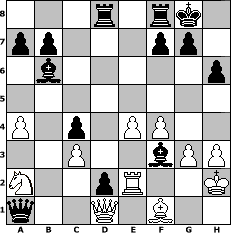 game notation in PGN-format [Event "ONCE A PAWN A TIME"] [Site "www.myChess.de"] [Date "2020.07.30"] [Round "1"] [White "lotchi"] [Black "Ziegert"] [ECO "C42"] [WhitemyELO "1168"] [BlackmyELO "2065"] [Result "0-1"] [TimeControl "10/3456000"] [WhiteDays "40"] [BlackDays "34"] [MyChessNo "118976"] 1. e4 e5 2. Nf3 Nf6 3. Nc3 Nc6 4. Bb5 Nd4 5. a4 c6 6. Be2 Bd6 7. d3 Bc7 8. Bg5 O-O 9. O-O h6 10. Bxf6 Qxf6 11. Nxd4 exd4 12. Na2 d5 13. g3 dxe4 14. dxe4 Bh3 15. Re1 c5 16. Rb1 Be6 17. Ra1 c4 18. f3 Rad8 19. f4 d3 20. Bf1 Qxb2 21. c3 Bb6+ 22. Kh1 d2 23. Re2 Bg4 24. h3 Bf3+ 25. Kh2 Qxa1 0-1 position notation in FEN-format 3r1rk1/pp3pp1/1b5p/8/P1p1PP2/2P2bPP/N2pR2K/q2Q1B2 - - - 0 26 Captured white pieces: Captured black pieces: Click on a captured piece in order to display the desired move!