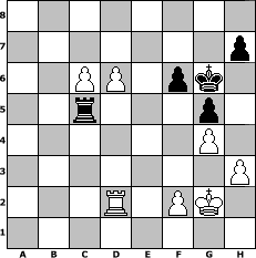 game notation in PGN-format [Event "FREUNDESTUNIER"] [Site "www.myChess.de"] [Date "2005.10.28"] [Round "2"] [White "Stecher1"] [Black "Master1"] [ECO "C64"] [WhitemyELO "1500"] [BlackmyELO "1605"] [Result "1-0"] [TimeControl "10/864000"] [WhiteDays "30"] [BlackDays "36"] [MyChessNo "19023"] 1. e4 e5 2. Nf3 Nc6 3. Bb5 Bc5 4. O-O Nge7 5. Nc3 O-O 6. d3 Nd4 7. Nxe5 c6 8. Bc4 d5 9. exd5 cxd5 10. Bb3 Nxb3 11. axb3 Bd4 12. Nf3 Bxc3 13. bxc3 Bg4 14. h3 Bxf3 15. Qxf3 Rc8 16. c4 b6 17. Ba3 f6 18. Bxe7 Qxe7 19. Qxd5+ Kh8 20. Rfe1 Qf7 21. Qxf7 Rxf7 22. Re2 g6 23. Rae1 Kg7 24. Re7 Rxe7 25. Rxe7+ Kh6 26. Rxa7 b5 27. g4 g5 28. Rb7 bxc4 29. bxc4 Ra8 30. Rb2 Re8 31. d4 Re4 32. c3 Re1+ 33. Kg2 Re4 34. c5 Kg6 35. d5 Rc4 36. c6 Rxc3 37. Rd2 Rc5 38. d6 1-0 position notation in FEN-format 8/7p/2PP1pk1/2r3p1/6P1/7P/3R1PK1/8 - - - 0 38 Captured white pieces: Captured black pieces: Click on a captured piece in order to display the desired move!