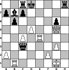 game notation in PGN-format [Event "M"] [Site "www.myChess.de"] [Date "2009.03.12"] [Round "1"] [White "muetoe"] [Black "sel"] [ECO "A06"] [WhitemyELO "1955"] [BlackmyELO "1335"] [Result "1-0"] [TimeControl "10/1728000"] [WhiteDays "17"] [BlackDays "19"] [MyChessNo "53588"] 1. Nf3 d5 2. d4 e6 3. c4 Nc6 4. Nc3 Bb4 5. e3 Bxc3+ 6. bxc3 h6 7. Bd3 Qf6 8. e4 dxe4 9. Bxe4 Nge7 10. O-O Bd7 11. Rb1 Rb8 12. Re1 b6 13. g3 g5 14. h4 gxh4 15. Nxh4 Ng6 16. Nxg6 fxg6 17. Bf4 Rc8 18. Bxc6 Bxc6 19. d5 Qxc3 20. Rxe6+ Kd7 21. Re4 Bb7 22. Qg4+ Kd8 23. Bg5+ hxg5 24. Qxg5+ 1-0 position notation in FEN-format 2rk3r/pbp5/1p4p1/3P2Q1/2P1R3/2q3P1/P4P2/1R4K1 - - - 0 24 Captured white pieces: Captured black pieces: Click on a captured piece in order to display the desired move!