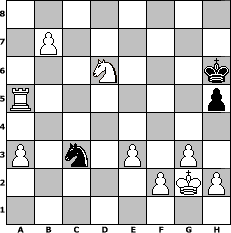 game notation in PGN-format [Event "und immer wieder Schach !"] [Site "www.myChess.de"] [Date "2009.11.06"] [Round "1"] [White "neve"] [Black "Ostseeboy"] [ECO "A80"] [WhitemyELO "1476"] [BlackmyELO "1202"] [Result "1-0"] [TimeControl "10/864000"] [WhiteDays "50"] [BlackDays "50"] [MyChessNo "60417"] 1. d4 f5 2. Nf3 Nf6 3. Nc3 e6 4. a3 Be7 5. e3 O-O 6. d5 b6 7. Bc4 Ne4 8. Nxe4 fxe4 9. Nd2 Kh8 10. Nxe4 exd5 11. Bxd5 Nc6 12. b4 Rb8 13. Bb2 Bb7 14. Qg4 Bf6 15. Bxf6 gxf6 16. Qh5 Ne7 17. Bxb7 Rxb7 18. Rd1 Ng6 19. c4 Qe7 20. Qf5 c6 21. O-O Rf7 22. g3 Qe5 23. Qxe5 Nxe5 24. Nd6 Rg7 25. Nxb7 d5 26. Nd6 Nf3+ 27. Kg2 Nh4+ 28. Kh3 Nf3 29. cxd5 Ng5+ 30. Kg2 cxd5 31. Rxd5 h5 32. Nf5 Rc7 33. Rfd1 Ne4 34. Rd8+ Kh7 35. R1d7+ Rxd7 36. Rxd7+ Kg6 37. Nd6 Nc3 38. Rxa7 f5 39. Rb7 Nd5 40. Rf7 Nf6 41. Rb7 Kg5 42. Rxb6 Nd5 43. Rb5 Nc3 44. Rxf5+ Kg6 45. Ra5 Na2 46. b5 Nc3 47. b6 Kh6 48. b7 1-0 position notation in FEN-format 8/1P6/3N3k/R6p/8/P1n1P1P1/5PKP/8 - - - 0 48 Captured white pieces: Captured black pieces: Click on a captured piece in order to display the desired move!