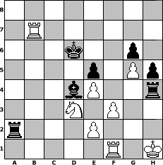 game notation in PGN-format [Event "Adventturnier"] [Site "www.myChess.de"] [Date "2021.11.16"] [Round "1"] [White "faustballer"] [Black "borsti"] [ECO "C23"] [WhitemyELO "1536"] [BlackmyELO "1328"] [Result "0-1"] [TimeControl "10/1728000"] [WhiteDays "20"] [BlackDays "20"] [MyChessNo "123545"] 1. e4 e5 2. Bc4 Bb4 3. Qh5 Qf6 4. Nf3 Nh6 5. Qxe5+ Qxe5 6. Nxe5 d6 7. Nd3 Ba5 8. b4 Bb6 9. h3 O-O 10. O-O Be6 11. Bxe6 fxe6 12. a4 a5 13. Ba3 Nc6 14. b5 Nd4 15. Nc3 Nxc2 16. Ra2 Nd4 17. Bb2 Nf7 18. Raa1 Ng5 19. h4 Nf7 20. Nd1 Ne5 21. Nxe5 dxe5 22. Bxd4 Bxd4 23. Rc1 Rac8 24. Rc2 Rf4 25. g3 Rxe4 26. Kg2 Rg4 27. f3 Rg6 28. g4 h5 29. g5 c5 30. bxc6 bxc6 31. Ne3 c5 32. Nc4 Ra8 33. Rb1 Kh7 34. d3 e4 35. dxe4 e5 36. Rb5 Rga6 37. Kg3 R8a7 38. Rd2 g6 39. Rd1 Rd7 40. Kg2 Raa7 41. Nxa5 Ra8 42. Nb3 Rxa4 43. Nxc5 Ra2+ 44. Kh1 Rf7 45. Rf1 Rf4 46. Rb7+ Kg8 47. Rb8+ Kf7 48. Rb7+ Ke8 49. Rb8+ Ke7 50. Rb7+ Kd6 51. Nd3 Rxh4# 0-1 position notation in FEN-format 8/1R6/3k2p1/4p1Pp/3bP2r/3N1P2/r3P3/5R1K - - - 0 52 Captured white pieces: ![]() ![]() ![]() ![]() ![]() ![]() ![]() ![]() ![]() ![]() ![]() ![]() ![]() ![]() ![]() Captured black pieces: ![]() ![]() ![]() ![]() ![]() ![]() ![]() ![]() ![]() ![]() ![]() ![]() ![]() ![]() ![]() Click on a captured piece in order to display the desired move!