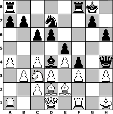 game notation in PGN-format [Event "Herbst Open 2014"] [Site "www.myChess.de"] [Date "2014.09.23"] [Round "1"] [White "Mattheus"] [Black "pepo47"] [ECO "A22"] [WhitemyELO "1200"] [BlackmyELO "2057"] [Result "0-1"] [TimeControl "10/3456000"] [WhiteDays "40"] [BlackDays "40"] [MyChessNo "96007"] 1. c4 e5 2. Nc3 Nf6 3. e4 Bc5 4. h3 Nc6 5. Nf3 O-O 6. d3 d6 7. Be2 Nd4 8. Nxd4 Bxd4 9. O-O c6 10. Bg5 h6 11. Bd2 Be6 12. b3 Nd7 13. Kh1 f5 14. f3 f4 15. a4 Bxh3 16. gxh3 Qh4 0-1 position notation in FEN-format r4rk1/pp1n2p1/2pp3p/4p3/P1PbPp1q/1PNP1P1P/2PBB3/R2Q1R1K - - - 1 17 Captured white pieces: Captured black pieces: Click on a captured piece in order to display the desired move!