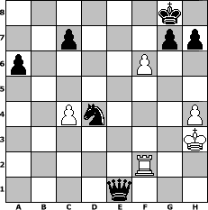 game notation in PGN-format [Event "unter uns Nr. 15, Weihnachtsturnier"] [Site "www.myChess.de"] [Date "2013.12.24"] [Round "1"] [White "Hobbykegler"] [Black "Knight"] [ECO "A15"] [WhitemyELO "1005"] [BlackmyELO "1236"] [Result "0-1"] [TimeControl "10/864000"] [WhiteDays "20"] [BlackDays "48"] [MyChessNo "91795"] 1. c4 Nf6 2. b3 e5 3. Bb2 Nc6 4. Qc2 d5 5. Nc3 d4 6. Nb5 Bc5 7. e4 O-O 8. Be2 a6 9. Na3 Be6 10. Nf3 Nb4 11. Qb1 d3 12. Bd1 Bg4 13. h3 Bxf3 14. Bxf3 Bd4 15. Bxd4 Qxd4 16. O-O Nxe4 17. Bxe4 Rfd8 18. Bxb7 Rab8 19. Bf3 e4 20. Bg4 Re8 21. Qd1 Nc6 22. Rc1 Nb4 23. Kh1 Nxa2 24. Rb1 Nb4 25. f3 exf3 26. Rxf3 Re7 27. Qf1 Rbe8 28. g3 f6 29. Rf4 Qb6 30. h4 Qc6+ 31. Kh2 Re2+ 32. Bxe2 Rxe2+ 33. Kh3 Qe6+ 34. g4 Nc6 35. b4 Rxd2 36. Re1 Re2 37. Rxe2 Qxe2 38. Qxe2 dxe2 39. Nc2 Nxb4 40. Rf2 Nxc2 41. g5 Nd4 42. gxf6 e1=Q 0-1 position notation in FEN-format 6k1/2p3pp/p4P2/8/2Pn3P/7K/5R2/4q3 - - - 0 43 Captured white pieces: Captured black pieces: Click on a captured piece in order to display the desired move!