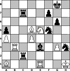 game notation in PGN-format [Event "Die Eisenbahner sind wieder da!!"] [Site "www.myChess.de"] [Date "2016.09.09"] [Round "1"] [White "Peterlie77 (C)"] [Black "nyffhans"] [Variant "Fischerrandom"] [SetUp "1"] [FEN "bnnrqbkr/pppppppp/8/8/8/8/PPPPPPPP/BNNRQBKR w KQkq - 0 1"] [WhitemyELO "2126"] [BlackmyELO "1989"] [Result "1/2-1/2"] [TimeControl "10/1728000"] [WhiteDays "70"] [BlackDays "27"] [MyChessNo "104846"] 1. e4 b6 2. Nc3 e6 3. b3 d5 4. exd5 exd5 5. d4 Qxe1 6. Rxe1 Bb7 7. Nd3 g6 8. h4 Bg7 9. Ne5 O-O 10. h5 Rfe8 11. hxg6 hxg6 12. Rd1 Ne7 13. Nf3 a6 14. Ne2 Nf5 15. Nf4 Nd6 16. a4 Nd7 17. g3 Nf6 18. Nd3 Nfe4 19. Bh3 a5 20. Kg2 c5 21. Nde5 Re7 22. Rhe1 c4 23. Kg1 Rc7 24. Rb1 Bc8 25. Bg2 Bf5 26. Nh4 cxb3 27. cxb3 Be6 28. Nhf3 Bh6 29. b4 Rc2 30. bxa5 bxa5 31. Nd3 Bd7 32. Nc5 Nxf2 33. Nxd7 Rxd7 34. Ne5 Rdc7 35. Bxd5 Nf5 36. Rb3 Nh3+ 37. Kh1 Be3 1/2-1/2 position notation in FEN-format 6k1/2r2p2/6p1/p2BNn2/P2P4/1R2b1Pn/2r5/B3R2K - - - 5 38 Captured white pieces: Captured black pieces: Click on a captured piece in order to display the desired move!