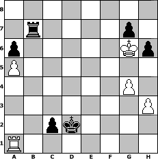 game notation in PGN-format [Event "CAISSA.COM IS DEAD TO ME!"] [Site "www.myChess.de"] [Date "2020.03.28"] [Round "1"] [White "borsti"] [Black "Joschi"] [ECO "A45"] [WhitemyELO "1244"] [BlackmyELO "1607"] [Result "0-1"] [TimeControl "10/2592000"] [WhiteDays "30"] [BlackDays "30"] [MyChessNo "117663"] 1. d4 Nf6 2. Bg5 e6 3. e3 d5 4. Nf3 c5 5. b3 Nc6 6. Nc3 a6 7. Bd3 Bd6 8. O-O h6 9. Bh4 cxd4 10. Nxd4 O-O 11. Nce2 e5 12. Nxc6 bxc6 13. c4 Bb7 14. Qd2 Re8 15. Rad1 Re6 16. h3 Qc7 17. Bg3 Rd8 18. Rc1 Qb8 19. Qa5 e4 20. Bc2 Bxg3 21. Nxg3 Red6 22. Nf5 R6d7 23. f3 exf3 24. Rxf3 dxc4 25. Nd4 cxb3 26. Bxb3 Qc7 27. Qxc7 Rxc7 28. Rc5 Nd5 29. Kf2 Kh7 30. Bxd5 Rxd5 31. Rf5 Rxf5+ 32. Nxf5 Bc8 33. Nd6 Be6 34. a3 f6 35. Kf3 Kg8 36. a4 Kf8 37. Kf4 Ke7 38. Nf5+ Bxf5 39. Kxf5 Kd6 40. Rc4 Kd5 41. Rd4+ Kc5 42. Ke4 Kb6 43. Kf5 c5 44. Rc4 Kc6 45. Ke6 Rb7 46. e4 Rb4 47. Rc3 c4 48. e5 fxe5 49. Kxe5 Kc5 50. Kf5 Kd4 51. Ra3 c3 52. Kg6 Rb7 53. a5 c2 54. Ra1 Kd3 55. g4 Kd2 0-1 position notation in FEN-format 8/1r4p1/p5Kp/P7/6P1/7P/2pk4/R7 - - - 1 56 Captured white pieces: Captured black pieces: Click on a captured piece in order to display the desired move!