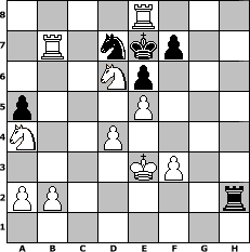 game notation in PGN-format [Event "13. HK-Turnier"] [Site "www.myChess.de"] [Date "2012.03.26"] [Round "2"] [White "lasker"] [Black "Hobbykegler"] [ECO "D10"] [WhitemyELO "1380"] [BlackmyELO "1035"] [Result "1-0"] [TimeControl "10/1728000"] [WhiteDays "15"] [BlackDays "20"] [MyChessNo "80840"] 1. d4 d5 2. c4 c6 3. Nc3 a6 4. Nf3 Qc7 5. cxd5 Bd7 6. dxc6 Bxc6 7. e4 e6 8. Bd3 Nd7 9. O-O O-O-O 10. Re1 h6 11. Be3 Ngf6 12. Rc1 g5 13. h3 g4 14. Nd2 gxh3 15. g3 h5 16. e5 Ng4 17. Be4 h2+ 18. Kh1 Rg8 19. f3 Nxe3 20. Rxe3 h4 21. gxh4 Rg1+ 22. Qxg1 hxg1=Q+ 23. Kxg1 Bxe4 24. Ndxe4 Bb4 25. Ree1 Rh8 26. Red1 Rg8+ 27. Kf2 Qc4 28. Na4 Rh8 29. Rxc4+ Kd8 30. Rxb4 Rxh4 31. Rxb7 Rh2+ 32. Ke3 Nf8 33. Nd6 a5 34. Rc1 Nd7 35. Rc8+ Ke7 36. Re8# 1-0 position notation in FEN-format 4R3/1R1nkp2/3Np3/p3P3/N2P4/4KP2/PP5r/8 - - - 5 36 Captured white pieces: Captured black pieces: Click on a captured piece in order to display the desired move!