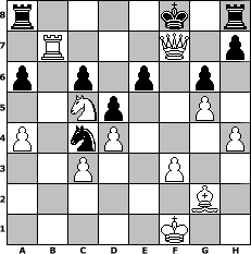game notation in PGN-format [Event "Fr"] [Site "www.myChess.de"] [Date "2016.01.30"] [Round "1"] [White "augustus"] [Black "Haneken"] [ECO "A50"] [WhitemyELO "1272"] [BlackmyELO "1082"] [Result "1-0"] [TimeControl "10/2592000"] [WhiteDays "120"] [BlackDays "119"] [MyChessNo "102276"] 1. d4 Nf6 2. c4 Ne4 3. Be3 e6 4. a3 Qf6 5. Nc3 Nxc3 6. bxc3 Nc6 7. c5 Na5 8. Rb1 Nc4 9. Bc1 Qf5 10. Bb2 d5 11. e4 Qxe4+ 12. Ne2 b6 13. f3 Qh4+ 14. g3 Qg5 15. Bc1 Qf5 16. Bf4 c6 17. g4 Qf6 18. a4 Na3 19. Rb3 Nc4 20. h4 bxc5 21. Bg2 Ba6 22. O-O Bd6 23. Bxd6 Nxd6 24. g5 Qg6 25. Nf4 Qf5 26. Qd2 Bxf1 27. Kxf1 Nc4 28. Qc1 Qd3+ 29. Nxd3 g6 30. Nxc5 Ke7 31. Qf4 a6 32. Rb7+ Kf8 33. Qxf7# 1-0 position notation in FEN-format r4k1r/1R3Q1p/p1p1p1p1/2Np2P1/P1nP3P/2P2P2/6B1/5K2 - - - 0 33 Captured white pieces: Captured black pieces: Click on a captured piece in order to display the desired move!