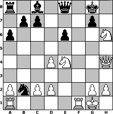 game notation in PGN-format [Event "R"] [Site "www.myChess.de"] [Date "2005.05.22"] [Round "1"] [White "Basal"] [Black "MichaelKnopf"] [ECO "D00"] [WhitemyELO "1813"] [BlackmyELO "1580"] [Result "1-0"] [TimeControl "10/864000"] [WhiteDays "10"] [BlackDays "10"] [MyChessNo "13290"] 1. d4 d5 2. e4 dxe4 3. Nc3 Nf6 4. f3 exf3 5. Nxf3 a6 6. Bg5 e6 7. Bd3 Be7 8. O-O O-O 9. Qe1 Nc6 10. Qh4 Nb4 11. Bxf6 Nxd3 12. Bxe7 Qe8 13. Bxf8 Qxf8 14. Ng5 h6 15. Nxf7 Qe8 16. Ne4 Nxb2 17. Nxh6+ 1-0 position notation in FEN-format r1b1q1k1/1pp3p1/p3p2N/8/3PN2Q/8/PnPP2PP/R4RK1 - - - 0 17 Captured white pieces: ![]() ![]() ![]() ![]() ![]() ![]() ![]() ![]() ![]() ![]() ![]() ![]() ![]() ![]() ![]() Captured black pieces: ![]() ![]() ![]() ![]() ![]() ![]() ![]() ![]() ![]() ![]() ![]() ![]() ![]() ![]() ![]() Click on a captured piece in order to display the desired move!