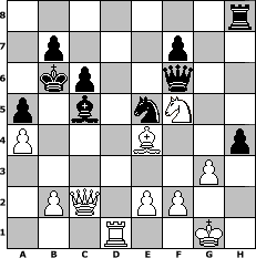 game notation in PGN-format [Event "Bremer Schl"] [Site "www.myChess.de"] [Date "2015.11.01"] [Round "1"] [White "Peterlie77 (C)"] [Black "dbuse"] [ECO "A11"] [WhitemyELO "2089"] [BlackmyELO "2171"] [Result "1/2-1/2"] [TimeControl "10/3456000"] [WhiteDays "115"] [BlackDays "115"] [MyChessNo "100980"] 1. c4 c6 2. d4 d5 3. Nf3 Nf6 4. Nc3 dxc4 5. a4 Bf5 6. Ne5 Nbd7 7. Nxc4 Qc7 8. g3 e5 9. dxe5 Nxe5 10. Bf4 Nfd7 11. Bg2 g5 12. Ne3 gxf4 13. Nxf5 O-O-O 14. O-O fxg3 15. hxg3 Nc5 16. Qc2 a5 17. Rfd1 h5 18. Rxd8+ Qxd8 19. Rd1 Qf6 20. Qd2 Kb8 21. Qf4 Ka7 22. Ne4 Nxe4 23. Bxe4 Bc5 24. Qc1 Kb6 25. Qc2 h4 1/2-1/2 position notation in FEN-format 7r/1p3p2/1kp2q2/p1b1nN2/P3B2p/6P1/1PQ1PP2/3R2K1 - - - 0 26 Captured white pieces: Captured black pieces: Click on a captured piece in order to display the desired move!