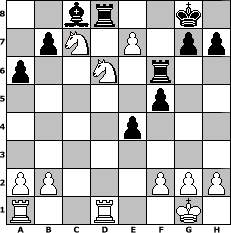game notation in PGN-format [Event "Mal wieder spielen 2"] [Site "www.myChess.de"] [Date "2013.05.12"] [Round "1"] [White "lmilde1 (adv.)"] [Black "Ziegert"] [ECO "C45"] [WhitemyELO "1507"] [BlackmyELO "1571"] [Result "1-0"] [TimeControl "10/1728000"] [WhiteDays "47"] [BlackDays "00"] [MyChessNo "88271"] 1. e4 e5 2. Nf3 Nc6 3. d4 exd4 4. Nxd4 Bc5 5. Be3 Qf6 6. c3 Nge7 7. Bc4 Ne5 8. Be2 d5 9. O-O dxe4 10. Nb5 Qc6 11. Bxc5 Qxc5 12. Qd4 Qxd4 13. cxd4 O-O 14. dxe5 Nd5 15. Bc4 c6 16. Bxd5 cxd5 17. Rd1 Be6 18. N1c3 a6 19. Nd6 f5 20. Nxd5 Rad8 21. Nc7 Bc8 22. e6 Rf6 23. e7 1-0 position notation in FEN-format 2br2k1/1pN1P1pp/p2N1r2/5p2/4p3/8/PP3PPP/R2R2K1 - - - 0 23 Captured white pieces: Captured black pieces: Click on a captured piece in order to display the desired move!