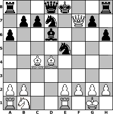 game notation in PGN-format [Event "3. Frankenwaldturnier"] [Site "www.myChess.de"] [Date "2007.05.07"] [Round "1"] [White "ujack1961"] [Black "Tommy6"] [ECO "C50"] [WhitemyELO "1795"] [BlackmyELO "1513"] [Result "1-0"] [TimeControl "10/1728000"] [WhiteDays "20"] [BlackDays "20"] [MyChessNo "34619"] 1. e4 e5 2. Nf3 Nc6 3. Bc4 h6 4. O-O Nf6 5. Re1 d6 6. c3 a6 7. d4 exd4 8. cxd4 Bg4 9. e5 dxe5 10. Be3 Bd6 11. dxe5 Bxf3 12. Qxf3 Nxe5 13. Bd4 Nfd7 14. Qxf7# 1-0 position notation in FEN-format r2qk2r/1ppn1Qp1/p2b3p/4n3/2BB4/8/PP2PPPP/RN2R1K1 - kq - 0 14 Captured white pieces: ![]() ![]() ![]() ![]() ![]() ![]() ![]() ![]() ![]() ![]() ![]() ![]() ![]() ![]() ![]() Captured black pieces: ![]() ![]() ![]() ![]() ![]() ![]() ![]() ![]() ![]() ![]() ![]() ![]() ![]() ![]() ![]() Click on a captured piece in order to display the desired move!