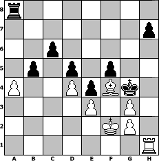 game notation in PGN-format [Event "Pfingst -Turnier"] [Site "www.myChess.de"] [Date "2009.05.30"] [Round "1"] [White "alpacino"] [Black "Master1"] [ECO "D01"] [WhitemyELO "1325"] [BlackmyELO "1304"] [Result "1-0"] [TimeControl "10/2592000"] [WhiteDays "108"] [BlackDays "102"] [MyChessNo "56164"] 1. d4 d5 2. Nc3 Nf6 3. Nf3 Bg4 4. Ne5 Nbd7 5. h3 Bf5 6. e3 e6 7. Bb5 c6 8. Nxd7 Qxd7 9. Bd3 Bxd3 10. cxd3 Bb4 11. O-O O-O 12. Ne2 Rfe8 13. a3 Bd6 14. Ng3 Bxg3 15. fxg3 e5 16. Bd2 e4 17. Bc3 a5 18. a4 b6 19. Rxf6 gxf6 20. Qf1 f5 21. dxe4 fxe4 22. Qf4 f5 23. Qg5+ Kh8 24. h4 Rg8 25. Qf6+ Rg7 26. h5 Kg8 27. h6 Rf8 28. Qxg7+ Qxg7 29. hxg7 Kxg7 30. b4 axb4 31. Bxb4 Ra8 32. Bd6 Kf6 33. Be5+ Kg5 34. Bf4+ Kg4 35. Kf2 b5 36. Rh1 1-0 position notation in FEN-format r7/7p/2p5/1p1p1p2/P2PpBk1/4P1P1/5KP1/7R - - - 1 36 Captured white pieces: ![]() ![]() ![]() ![]() ![]() ![]() ![]() ![]() ![]() ![]() ![]() ![]() ![]() ![]() ![]() Captured black pieces: ![]() ![]() ![]() ![]() ![]() ![]() ![]() ![]() ![]() ![]() ![]() ![]() ![]() ![]() ![]() Click on a captured piece in order to display the desired move!