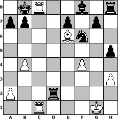 game notation in PGN-format [Event "8o Jahre Martin Gr,B 1000-1799 DWZ."] [Site "www.myChess.de"] [Date "2015.02.26"] [Round "1"] [White "martinus"] [Black "kalle"] [ECO "A56"] [WhitemyELO "1756"] [BlackmyELO "1610"] [Result "1-0"] [TimeControl "10/2592000"] [WhiteDays "30"] [BlackDays "29"] [MyChessNo "98311"] 1. d4 Nf6 2. c4 c5 3. Nf3 d6 4. dxc5 Qa5+ 5. Bd2 Qxc5 6. e3 Bg4 7. h3 Bh5 8. Qa4+ Qc6 9. Qxc6+ Nxc6 10. g4 Bg6 11. Nc3 O-O-O 12. Bg2 h5 13. g5 Ne4 14. Nxe4 Bxe4 15. O-O f6 16. Rac1 Bxf3 17. Bxf3 Ne5 18. Bd5 fxg5 19. f4 gxf4 20. exf4 Nd7 21. b4 Nf6 22. Be6+ Kc7 23. c5 dxc5 24. Rxc5+ Kb8 25. Rfc1 Rxd2 26. Rc8# 1-0 position notation in FEN-format 1kR2b1r/pp2p1p1/4Bn2/7p/1P3P2/7P/P2r4/2R3K1 - - - 1 26 Captured white pieces: Captured black pieces: Click on a captured piece in order to display the desired move!