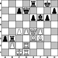 game notation in PGN-format [Event "Sp"] [Site "www.myChess.de"] [Date "2011.09.07"] [Round "1"] [White "BobbyF4"] [Black "Haki"] [ECO "B06"] [WhitemyELO "1495"] [BlackmyELO "1319"] [Result "0-1"] [TimeControl "10/1728000"] [WhiteDays "00"] [BlackDays "20"] [MyChessNo "76164"] 1. e4 g6 2. d4 d5 3. c4 dxe4 4. Nc3 Bg7 5. Be3 Nf6 6. Nge2 O-O 7. Ng3 Bg4 8. Qb3 b6 9. h3 Bc8 10. O-O-O Ne8 11. Ngxe4 Nd7 12. g4 Bb7 13. f4 a5 14. Rh2 e6 15. a3 Nd6 16. Bg2 Nxe4 17. Nxe4 Bxe4 18. Bxe4 Rb8 19. h4 Nf6 20. Bf3 Re8 21. Rhd2 Qd7 22. h5 b5 23. hxg6 fxg6 24. g5 a4 25. Qc2 b4 26. axb4 Rxb4 27. gxf6 Bxf6 28. Qd3 Rb3 29. Qe4 a3 0-1 position notation in FEN-format 4r1k1/2pq3p/4pbp1/8/2PPQP2/pr2BB2/1P1R4/2KR4 - - - 0 30 Captured white pieces: Captured black pieces: Click on a captured piece in order to display the desired move!