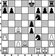 game notation in PGN-format [Event "WRG"] [Site "www.myChess.de"] [Date "2007.02.23"] [Round "1"] [White "cheldele"] [Black "Phantasos"] [ECO "C15"] [WhitemyELO "1490"] [BlackmyELO "2133"] [Result "0-1"] [TimeControl "10/2592000"] [WhiteDays "60"] [BlackDays "53"] [MyChessNo "32792"] 1. e4 e6 2. d4 d5 3. Nc3 Bb4 4. a3 Bxc3 5. bxc3 dxe4 6. f3 c5 7. Be3 Qa5 8. Qd2 Nf6 9. Nh3 Nc6 10. Be2 e5 11. O-O cxd4 12. cxd4 Qxd2 13. Bxd2 Nxd4 14. Bc4 Bxh3 15. gxh3 Nxf3+ 0-1 position notation in FEN-format r3k2r/pp3ppp/5n2/4p3/2B1p3/P4n1P/2PB3P/R4RK1 - kq - 0 16 Captured white pieces: ![]() ![]() ![]() ![]() ![]() ![]() ![]() ![]() ![]() ![]() ![]() ![]() ![]() ![]() ![]() Captured black pieces: ![]() ![]() ![]() ![]() ![]() ![]() ![]() ![]() ![]() ![]() ![]() ![]() ![]() ![]() ![]() Click on a captured piece in order to display the desired move!