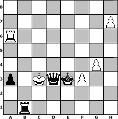 game notation in PGN-format [Event "Bis1400"] [Site "www.myChess.de"] [Date "2009.06.21"] [Round "1"] [White "gunni50"] [Black "beowulf"] [ECO "C55"] [WhitemyELO "1283"] [BlackmyELO "1363"] [Result "0-1"] [TimeControl "10/2592000"] [WhiteDays "177"] [BlackDays "179"] [MyChessNo "56779"] 1. e4 e5 2. Nf3 Nc6 3. Bc4 Nf6 4. c3 d5 5. exd5 Nxd5 6. Bb5 Bd7 7. O-O e4 8. Re1 Nf6 9. d4 Be7 10. Ne5 Nxe5 11. Bxd7+ Nexd7 12. Bg5 O-O 13. Bxf6 Nxf6 14. Nd2 Qd5 15. Qc2 Rae8 16. Nxe4 Nxe4 17. Rxe4 Bd6 18. Rh4 g6 19. c4 Qg5 20. Rh3 f5 21. Qb3 Re2 22. c5+ Kg7 23. cxd6 cxd6 24. Qd3 Rxb2 25. d5 Qd2 26. Qxd2 Rxd2 27. Re3 Kf7 28. Rae1 Rxa2 29. Re7+ Kg8 30. Rxb7 Ra5 31. h3 Rf7 32. Re8+ Kg7 33. Rxf7+ Kxf7 34. Ra8 Kf6 35. Rb8 h5 36. Rf8+ Ke5 37. Re8+ Kxd5 38. Rg8 Ke4 39. Rxg6 d5 40. f3+ Ke5 41. Rg5 d4 42. Rxh5 Rd5 43. Kf2 a5 44. g4 d3 45. Ke1 a4 46. Rh8 a3 47. Ra8 d2+ 48. Kd1 Rd3 49. Ra5+ Kf6 50. Rxf5+ Kg6 51. Ra5 Kf6 52. Ra6+ Ke5 53. h4 Kf4 54. h5 Ke3 55. h6 Rb3 56. h7 Rb1+ 57. Kc2 d1=Q+ 58. Kc3 Qd3# 0-1 position notation in FEN-format 8/7P/R7/8/6P1/p1KqkP2/8/1r6 - - - 2 59 Captured white pieces: Captured black pieces: Click on a captured piece in order to display the desired move!