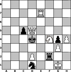game notation in PGN-format [Event "Knight Moves"] [Site "www.myChess.de"] [Date "2005.05.20"] [Round "1"] [White "Knight"] [Black "PublicEnemy"] [ECO "D00"] [WhitemyELO "1237"] [BlackmyELO "1293"] [Result "1-0"] [TimeControl "10/2592000"] [WhiteDays "150"] [BlackDays "089"] [MyChessNo "13227"] 1. d4 d5 2. e4 f5 3. e5 e6 4. Nf3 c5 5. dxc5 Bxc5 6. Bg5 Be7 7. Bb5+ Bd7 8. Bxe7 Qa5+ 9. Nc3 Bxb5 10. b4 Qc7 11. Nxb5 Qxe7 12. Nfd4 Qxb4+ 13. Kf1 Nc6 14. Nc7+ Kd8 15. Ncxe6+ Kd7 16. Nxc6 bxc6 17. Nxg7 Qg4 18. e6+ Ke7 19. Qxg4 fxg4 20. g3 Kf6 21. Nh5+ Kxe6 22. Kg2 Nf6 23. Rhe1+ Kf7 24. Nf4 Rhe8 25. h4 h5 26. Rab1 Ne4 27. Nxh5 Nc3 28. Rxe8 Rxe8 29. Rb7+ Kg6 30. Nf4+ Kf5 31. Rf7+ Ke4 32. Rxa7 Rc8 33. a4 Rb8 34. a5 Nd1 35. a6 Rb2 36. Re7+ Kd4 37. a7 Rxc2 38. a8=Q Rxf2+ 39. Kg1 c5 40. Qxd5+ 1-0 position notation in FEN-format 8/4R3/8/2pQ4/3k1NpP/6P1/3P1r2/3n2K1 - - - 0 40 Captured white pieces: Captured black pieces: Click on a captured piece in order to display the desired move!