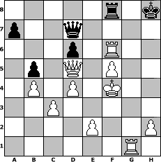 game notation in PGN-format [Event "Der Beste hinter den 1900ern(1/10) oder 10 hoch 2"] [Site "www.myChess.de"] [Date "2009.07.09"] [Round "1"] [White "BobbyF4"] [Black "Juliette2103"] [ECO "C24"] [WhitemyELO "1567"] [BlackmyELO "1522"] [Result "1-0"] [TimeControl "10/864000"] [WhiteDays "08"] [BlackDays "03"] [MyChessNo "57289"] 1. e4 e5 2. Bc4 Nf6 3. Nf3 Nc6 4. Nc3 Bc5 5. d3 O-O 6. Bg5 h6 7. Bh4 Be7 8. Bxf6 Bxf6 9. Nd5 Nd4 10. c3 Ne6 11. Nxf6+ Qxf6 12. O-O d6 13. b4 Bd7 14. a4 c6 15. g3 b5 16. axb5 cxb5 17. Bd5 Rad8 18. Nh4 Ng5 19. f4 exf4 20. d4 Nh3+ 21. Kg2 Qg5 22. Nf5 Bxf5 23. exf5 Qxf5 24. Qb3 g5 25. Rae1 Qg4 26. Bf3 Qd7 27. g4 h5 28. Kxh3 Kg7 29. Qd5 f5 30. gxf5 g4+ 31. Bxg4 hxg4+ 32. Kxg4 Rf6 33. Kxf4 Rh8 34. Re6 Rhf8 35. Rg1+ Kh8 36. Rxf6 1-0 position notation in FEN-format 5r1k/p2q4/3p1R2/1p1Q1P2/1P1P1K2/2P5/4P2P/6R1 - - - 0 36 Captured white pieces: Captured black pieces: Click on a captured piece in order to display the desired move!