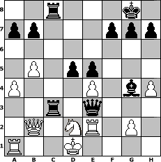 game notation in PGN-format [Event "?"] [Site "www.myChess.de"] [Date "2025.11.15"] [Round "?"] [White "Achimkogge"] [Black "pillepalle"] [ECO "D00"] [WhitemyELO "1236"] [BlackmyELO "2065"] [Result "0-1"] [TimeControl "10/1728000"] [WhiteDays "59"] [BlackDays "43"] [MyChessNo "133947"] 1. d4 d5 2. c3 Nf6 3. Bf4 c5 4. dxc5 Nc6 5. Qa4 Bd7 6. f3 e5 7. Bg5 Bxc5 8. Nd2 Qb6 9. b4 Bf2+ 10. Kd1 Bxg1 11. b5 Ne7 12. e3 Bxe3 13. Bxe3 Qxe3 14. Qb3 O-O 15. a4 Rac8 16. h3 Rxc3 17. Qb2 Nf5 18. Be2 Rfc8 19. h4 Ng3 20. Re1 Nfe4 21. fxe4 Nxe2 22. Rxe2 Bg4 0-1 position notation in FEN-format 2r3k1/pp3ppp/8/1P1pp3/P3P1bP/2r1q3/1Q1NR1P1/R2K4 - - - 1 23 Captured white pieces: Captured black pieces: Click on a captured piece in order to display the desired move!