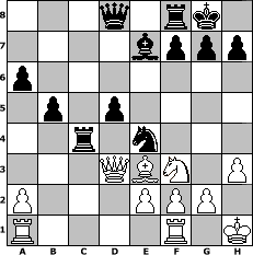 game notation in PGN-format [Event "MLN Winterturnier 2013"] [Site "www.myChess.de"] [Date "2013.12.01"] [Round "1"] [White "kalle"] [Black "mattse"] [ECO "C78"] [WhitemyELO "1611"] [BlackmyELO "1784"] [Result "0-1"] [TimeControl "10/2592000"] [WhiteDays "29"] [BlackDays "30"] [MyChessNo "91426"] 1. e4 e5 2. Nf3 Nc6 3. Bb5 a6 4. Ba4 Nf6 5. O-O b5 6. Bb3 d6 7. d3 Be7 8. c3 O-O 9. Nbd2 Na5 10. Bc2 c5 11. Nb3 Nc6 12. d4 exd4 13. cxd4 c4 14. Nbd2 Bg4 15. Kh1 Nxd4 16. h3 Nxc2 17. Qxc2 Bh5 18. b3 Rc8 19. bxc4 Bxf3 20. Nxf3 Rxc4 21. Qd3 Nxe4 22. Be3 d5 0-1 position notation in FEN-format 3q1rk1/4bppp/p7/1p1p4/2r1n3/3QBN1P/P3PPP1/R4R1K - - - 0 23 Captured white pieces: Captured black pieces: Click on a captured piece in order to display the desired move!