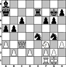game notation in PGN-format [Event "wie w"] [Site "www.myChess.de"] [Date "2013.11.16"] [Round "1"] [White "reisinger"] [Black "Duschgel"] [ECO "D82"] [WhitemyELO "1507"] [BlackmyELO "1587"] [Result "0-1"] [TimeControl "10/1728000"] [WhiteDays "20"] [BlackDays "20"] [MyChessNo "91111"] 1. d4 Nf6 2. c4 g6 3. Nc3 d5 4. Bf4 Bg7 5. Be5 O-O 6. Qc2 dxc4 7. e3 Nc6 8. Rd1 a6 9. Bxc4 b5 10. Bb3 Bb7 11. Nf3 Nb4 12. Qe2 c6 13. e4 a5 14. a3 Na6 15. O-O Qb6 16. d5 Nc5 17. d6 Nxb3 18. dxe7 Rfe8 19. Rd6 Ng4 20. Bxg7 Kxg7 21. Qc2 Nc5 22. Nd5 Qa7 23. Nc7 Rxe7 24. Nxa8 Bxa8 25. Qc3+ f6 26. h3 Nxe4 27. Qe1 Nxd6 28. Qc3 Ne4 0-1 position notation in FEN-format b7/q3r1kp/2p2pp1/pp6/4n1n1/P1Q2N1P/1P1P1PP1/5RK1 - - - 2 29 Captured white pieces: Captured black pieces: Click on a captured piece in order to display the desired move!