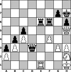 game notation in PGN-format [Event "4. Norderstedter DENK MAL Open 2013"] [Site "www.myChess.de"] [Date "2013.01.09"] [Round "1"] [White "UPS"] [Black "martinus"] [ECO "B23"] [WhitemyELO "1714"] [BlackmyELO "1702"] [Result "0-1"] [TimeControl "10/2592000"] [WhiteDays "01"] [BlackDays "30"] [MyChessNo "86067"] 1. e4 c5 2. Nc3 Nc6 3. Nf3 d6 4. Bb5 Bd7 5. O-O Nf6 6. Re1 a6 7. Bc4 b5 8. Bd5 b4 9. Ne2 e6 10. Bxc6 Bxc6 11. d3 Be7 12. c3 a5 13. Ng3 O-O 14. c4 h6 15. b3 a4 16. Bb2 a3 17. Bc1 Nd7 18. h3 Bf6 19. Rb1 Ne5 20. Nh2 Bh4 21. Bf4 Ng6 22. Qg4 Nxf4 23. Qxf4 Bg5 24. Qg4 Bd7 25. f4 f5 26. exf5 exf5 27. Qf3 Bf6 28. Qd5+ Kh8 29. Qxd6 Bd4+ 30. Kh1 Rf6 31. Qd5 Raa6 32. Qf3 Bc6 33. Qh5 Bf2 34. Nxf5 Bxe1 35. Rxe1 Qxd3 36. Ne7 Kh7 37. Nxc6 Raxc6 38. g3 Rce6 0-1 position notation in FEN-format 8/6pk/4rr1p/2p4Q/1pP2P2/pP1q2PP/P6N/4R2K - - - 1 39 Captured white pieces: Captured black pieces: Click on a captured piece in order to display the desired move!