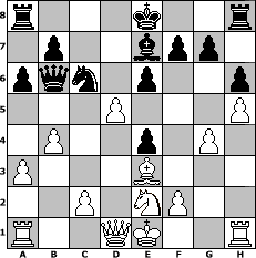 game notation in PGN-format [Event "April April"] [Site "www.myChess.de"] [Date "2014.04.03"] [Round "2"] [White "faustballer"] [Black "Joschi"] [ECO "B10"] [WhitemyELO "1535"] [BlackmyELO "1535"] [Result "1-0"] [TimeControl "10/2592000"] [WhiteDays "60"] [BlackDays "60"] [MyChessNo "93848"] 1. e4 c6 2. Bc4 d5 3. exd5 cxd5 4. Be2 Nf6 5. h3 Nc6 6. d4 Bf5 7. a3 e6 8. h4 h6 9. g4 Bg6 10. Bf3 Be7 11. Nc3 a6 12. h5 Bh7 13. Be3 Qa5 14. Nge2 Be4 15. b4 Qb6 16. Bxe4 Nxe4 17. Nxe4 dxe4 18. d5 1-0 position notation in FEN-format r3k2r/1p2bpp1/pqn1p2p/3P3P/1P2p1P1/P3B3/2P1NP2/R2QK2R - KQkq - 0 18 Captured white pieces: Captured black pieces: Click on a captured piece in order to display the desired move!