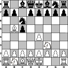 game notation in PGN-format [Event "Der HSF feiert 3.Geburtstag-feiert gern mit!"] [Site "www.myChess.de"] [Date "2013.05.01"] [Round "1"] [White "Vahl1"] [Black "Tigerle"] [ECO "B30"] [WhitemyELO "1659"] [BlackmyELO "1588"] [Result "1-0"] [TimeControl "10/2592000"] [WhiteDays "29"] [BlackDays "00"] [MyChessNo "88119"] 1. e4 c5 2. Nf3 Nc6 3. Bb5 1-0 position notation in FEN-format r1bqkbnr/pp1ppppp/2n5/1Bp5/4P3/5N2/PPPPPPPP/RNBQK2R - KQkq - 3 3 Captured white pieces: ![]() ![]() ![]() ![]() ![]() ![]() ![]() ![]() ![]() ![]() ![]() ![]() ![]() ![]() ![]() Captured black pieces: ![]() ![]() ![]() ![]() ![]() ![]() ![]() ![]() ![]() ![]() ![]() ![]() ![]() ![]() ![]() Click on a captured piece in order to display the desired move!