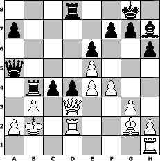 game notation in PGN-format [Event "Broadsword Chess"] [Site "www.myChess.de"] [Date "2014.06.15"] [Round "1"] [White "martinus"] [Black "HenrySchinasky"] [ECO "E21"] [WhitemyELO "1770"] [BlackmyELO "2113"] [Result "0-1"] [TimeControl "10/864000"] [WhiteDays "24"] [BlackDays "19"] [MyChessNo "94837"] 1. d4 Nf6 2. c4 e6 3. Nc3 Bb4 4. Nf3 b6 5. Qc2 Bb7 6. Bg5 h6 7. Bd2 O-O 8. O-O-O Bxc3 9. Bxc3 Be4 10. Qd2 Bh7 11. g3 b5 12. Bg2 Ne4 13. Qe3 bxc4 14. Ne5 Nxc3 15. Qxc3 d5 16. Nxc4 Nd7 17. Ne5 Nxe5 18. dxe5 c5 19. e4 d4 20. Qd3 Rb8 21. Rd2 Qa5 22. b3 Rfd8 23. f4 Rb4 24. Kb2 c4 0-1 position notation in FEN-format 3r2k1/p4ppb/4p2p/q3P3/1rppPP2/1P1Q2P1/PK1R2BP/7R - - - 0 25 Captured white pieces: Captured black pieces: Click on a captured piece in order to display the desired move!